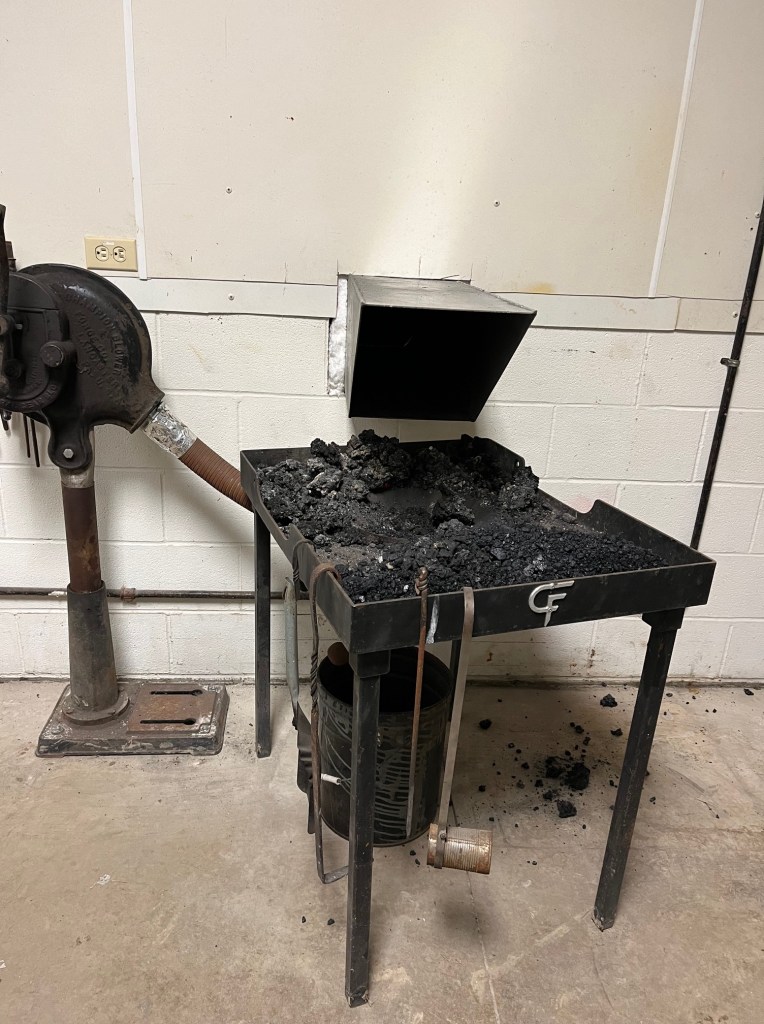 The new (to me) stack was a gift from a friend. This new set up is called “side draft”. The chimney effectively pulls the green foul smoke from the burning coal away efficiently and quickly. The smoke was a real problem with my last set up, but this works very well.