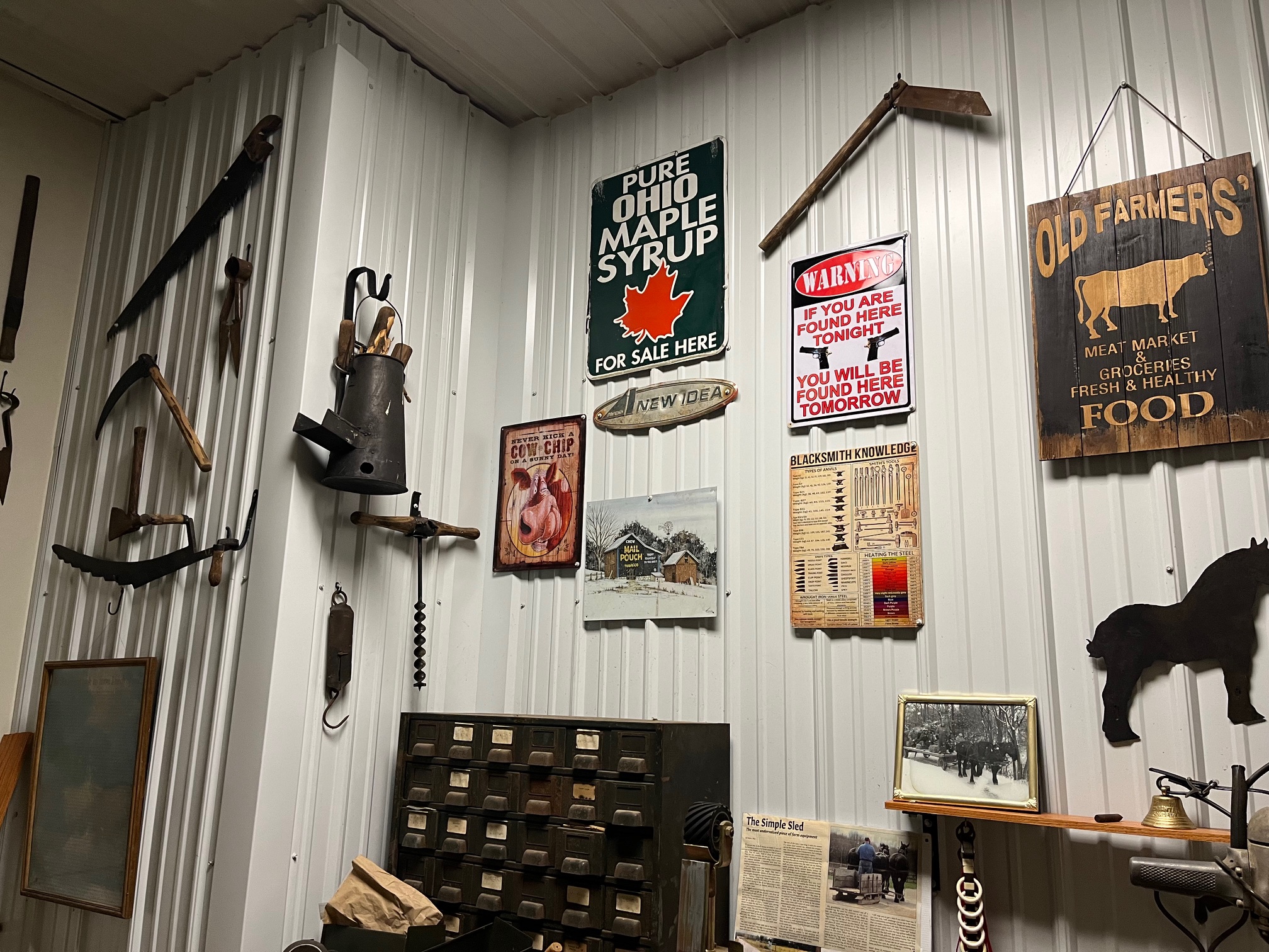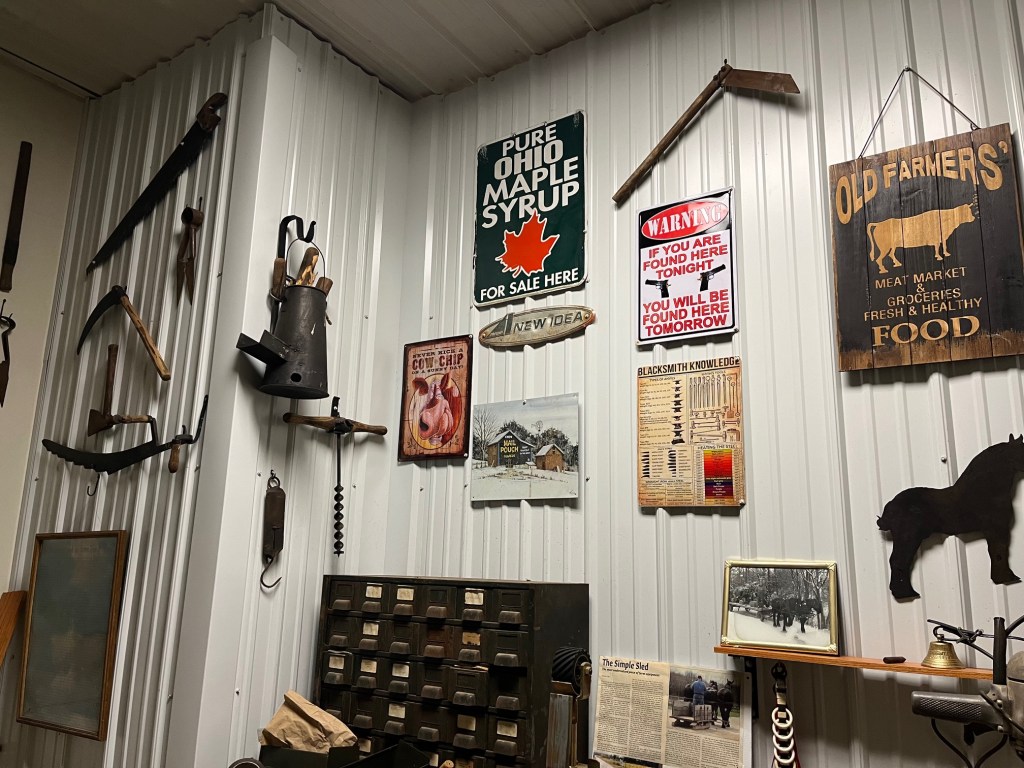 As I made the move, I decided to hang up a bunch of my great grandfather’s tools. I remember him using a lot of them. I think its neat to share a part of family history with visitors and family members. Once I got most of his stuff hung up, I realized that I had more wall than stuff. This prompted me to hang up some of my “treasures” gathered over the years. I now have an eclectic mix of tools, pictures and “man stuff” adorning the walls of my blacksmithing man cave!