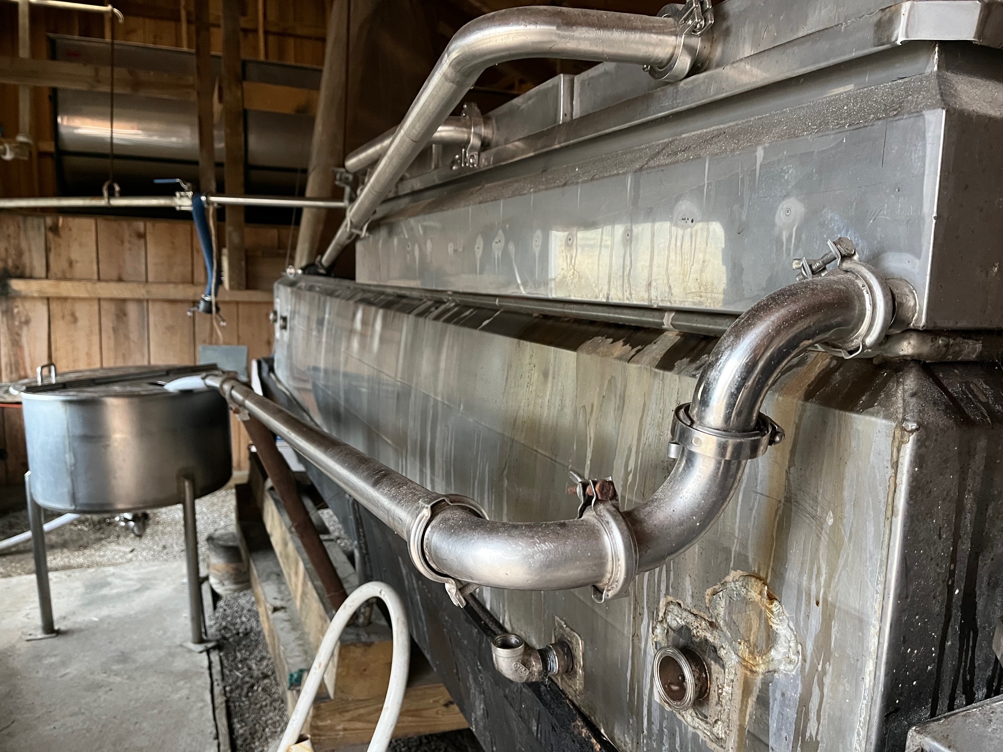 In the photo above, the evaporator has been partially disassembled. It is all part of the clean up process. Much of the clean up job has been completed. The tanks and many small parts, pieces, buckets, utensils and specialized equipment, have been washed dried and put away. The biggest and last job is to wash the evaporator.