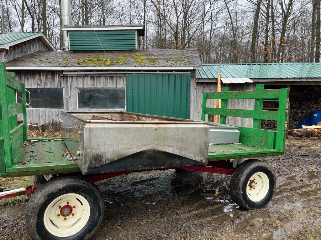 I load the evaporator pans onto a couple of hay wagons. I have to enlist help because the pans are awkward and heavy. This years help came for two of our grandchildren and a few of their friends. Many hands make light work, but this work was still heavy, sticky and sooty. The pans will get pressure washed and cleaned in the coming days.