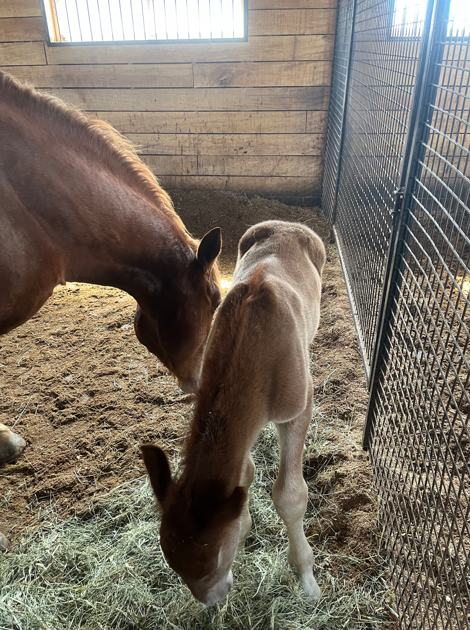 Our foaling season has started. Welcome to the farm little girl. We named her Riceland Meadows Rubee. Her mom Lakeview Amee approves! She was born last night. Mom and baby doing great.