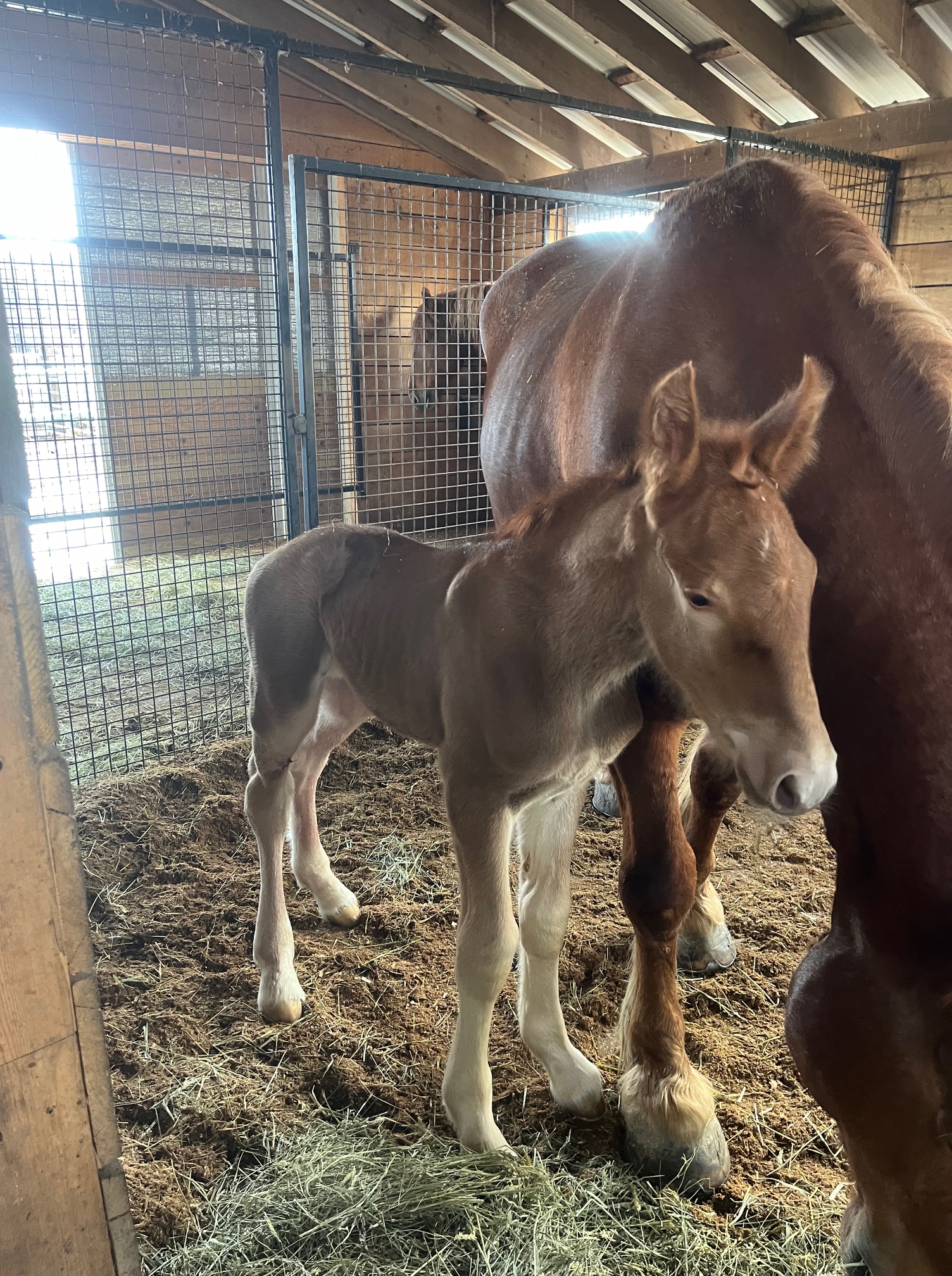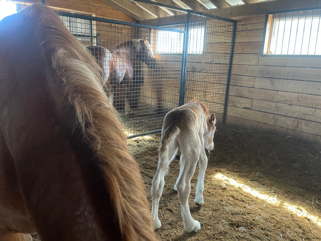 Like all foals she is a bit wobbly on her legs and feet. She spent 11 months folded up in a tight space. She is getting stronger by the hour.