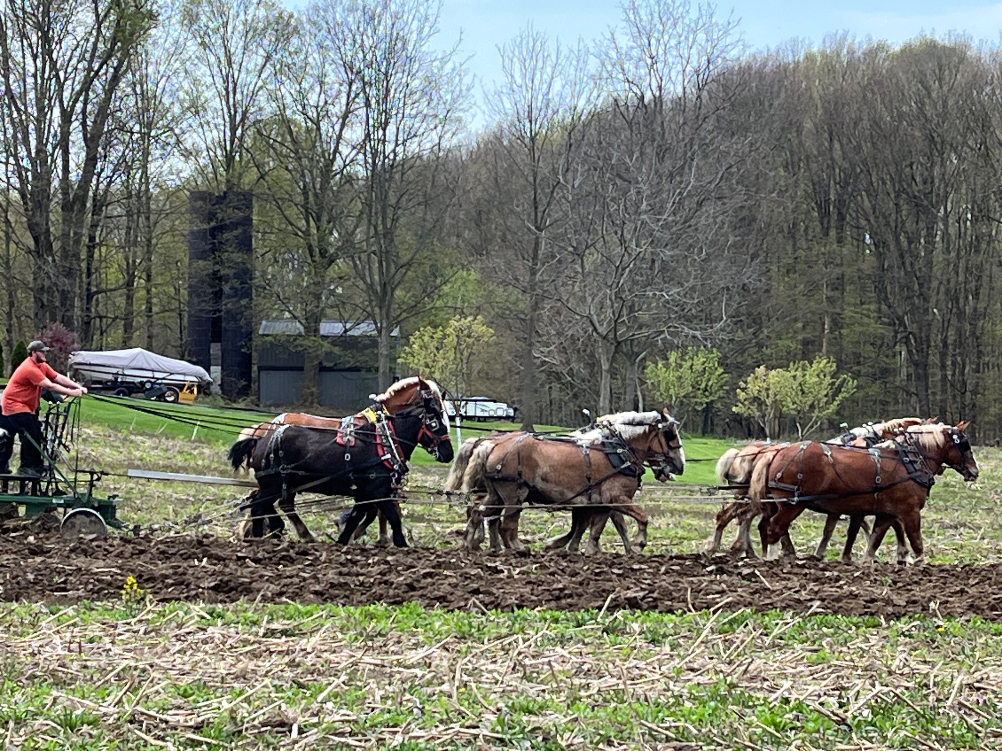 The last few days of April found us to be very busy. We attended a local plow fun day for draft horses and friends. In the photo above, just to showcase the power of the draft horse, nine horses were put to a two bottom plow. This was a combination of teams from different teamsters and meant to please the crowd, which I think it did.