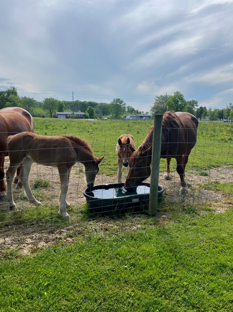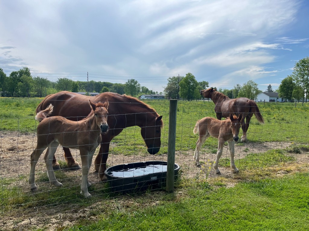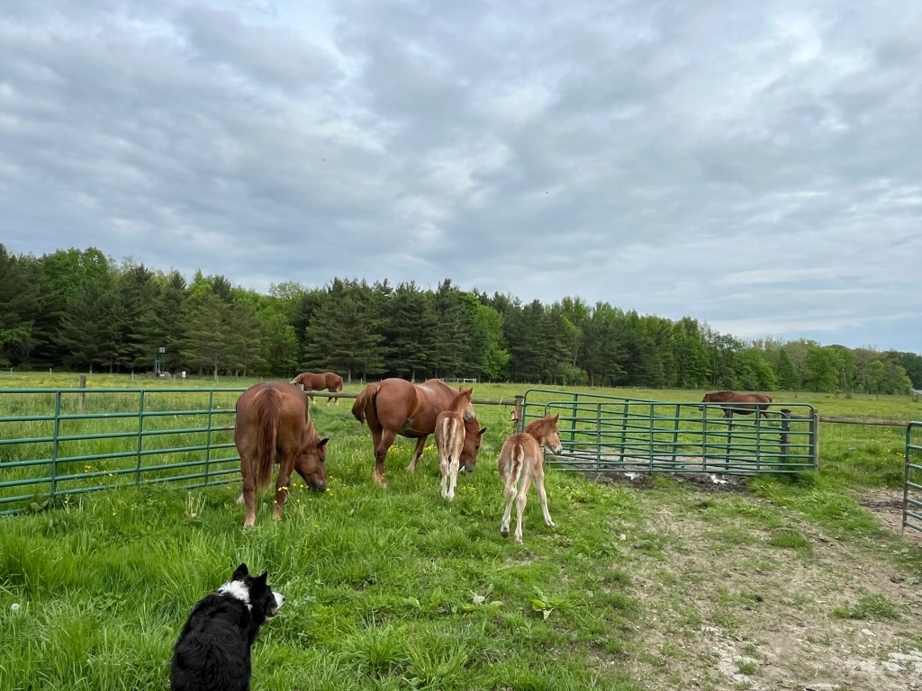 In the far pasture, Hank and Abby graze as I turn the moms and babies out into an adjacent paddock. It is better this way for now, once the brood mares are bred back, they can all be together again. This separation keeps the daily drama at a manageable level for now.