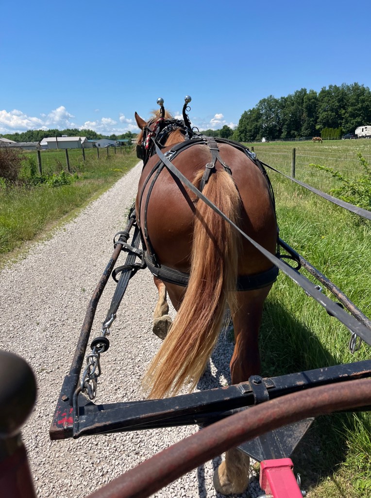 2-Year old Grace, doing well in the cart. She will start working in a team this week. She has done well on her own. She is now ready to work with a partner. I am choosing to work her with her momma Amee. Amee is a solid work horse and a great trainer.