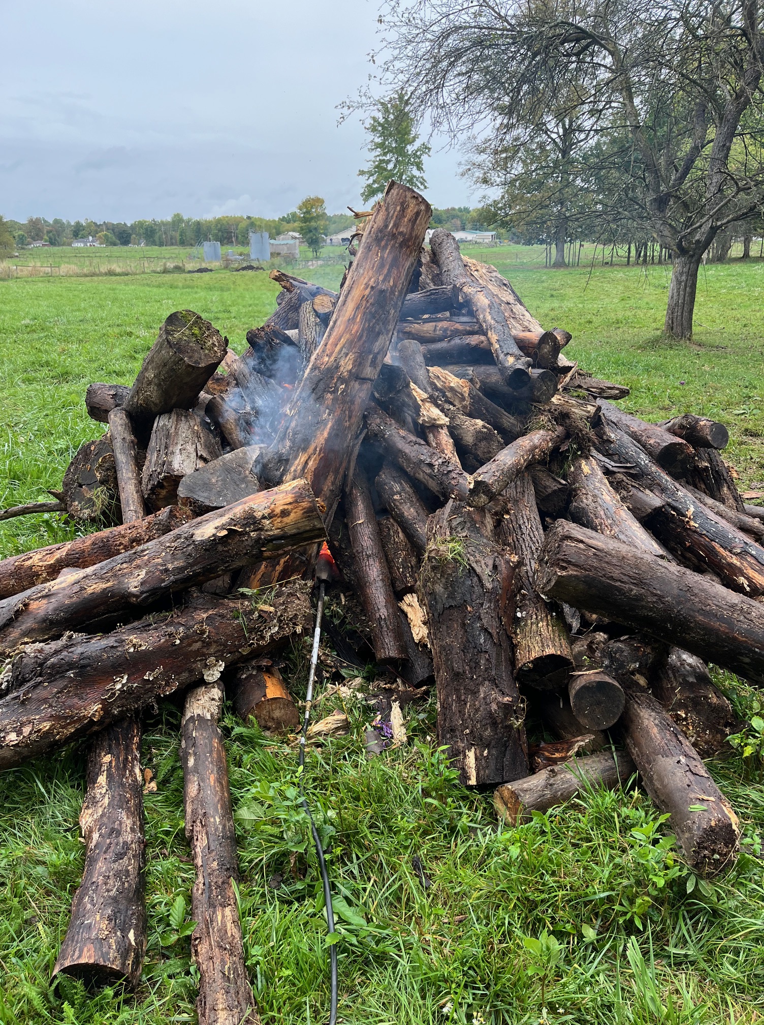 I made use of the damp soil and wet grass to burn some old firewood. It was a pile that I have been working out of for the last 3 years. What was left was “punky”. This means it would burn, but the BTU’s are significantly reduced. It was campfire wood, but not the type needed to boil maple sap. I made a pile for the small animals to use this winter for housing, but the rest I reduced to wood ash for the compost heap.