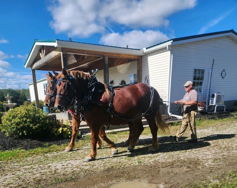 Our young horses will get a chance to learn all about logging too. Here Amee teaches her daughter Grace how to work as a team. This was Grace’s first time hitched as a team. We are walking back to the barn after pulling a wagon. She is learning quickly and easily. We are proud of our girl. Grace is in the foreground of the photo. (Some of you will remember that Grace fell into an old hand dug well as a weanling. She recovered fine and will soon be a integral part of our farming operation.)
