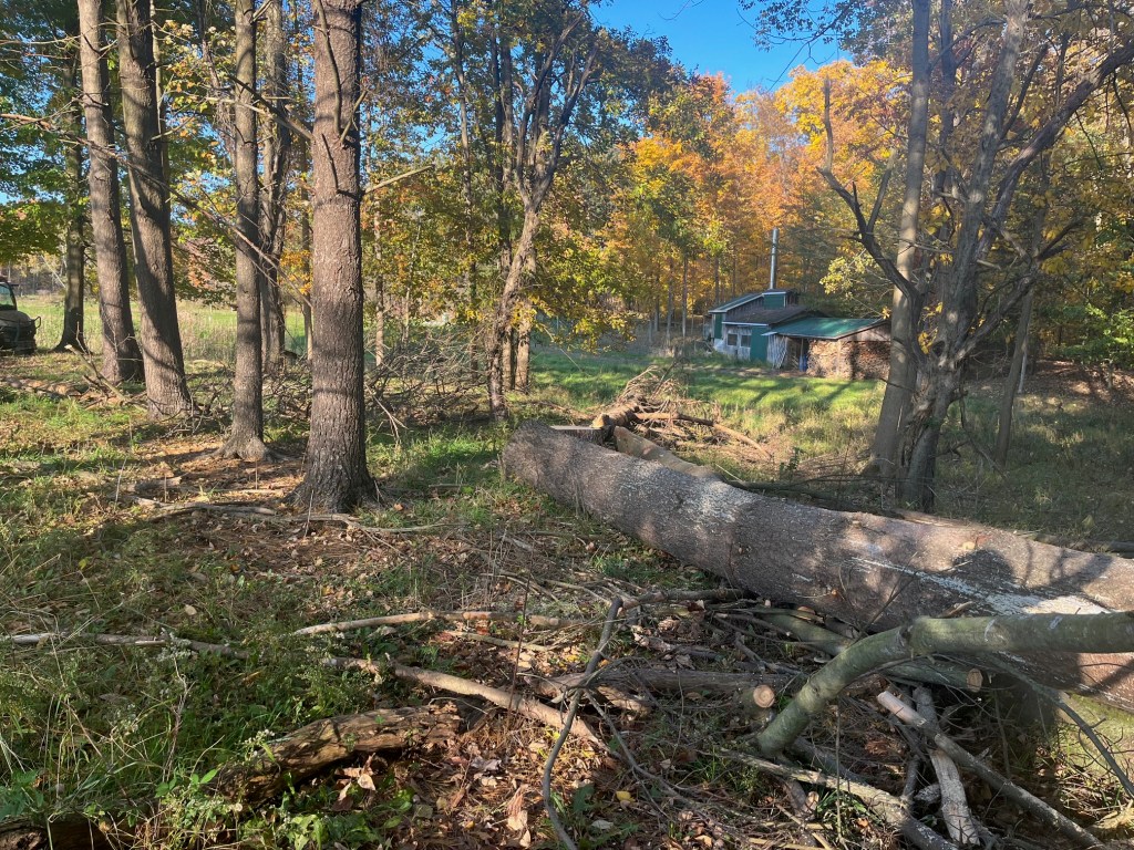 Upon returning home, I was inspired to continue filling our sugarhouse woodshed. I started cleaning up some wind blown, dead and down trees. The location is near the sugarhouse, on a small hill that can use some attention.