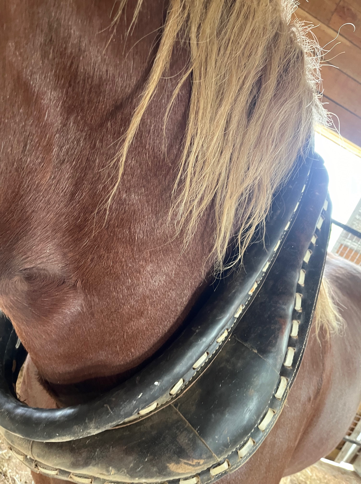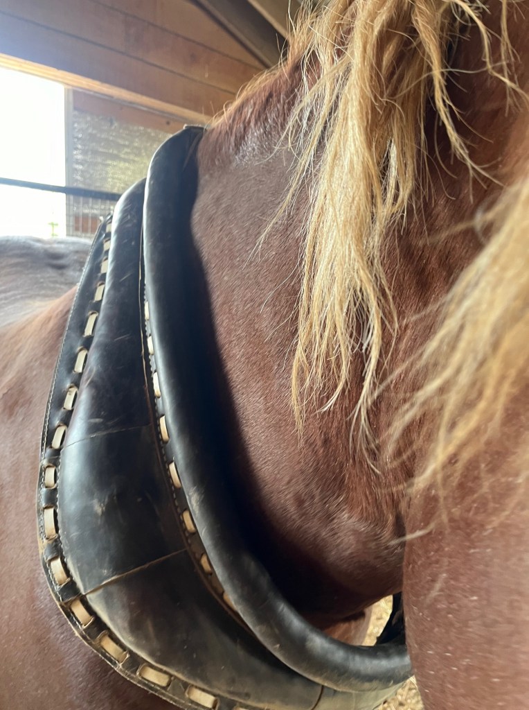 This is Hank’s new collar. I don’t think he will be in it very long either. He was wearing a 25″ with a pad. This collar is a 27″ and as you can see, there is no room for a pad underneath. He jumped two sizes. This collar is back on his shoulders. There is just enough room for the flat of my hand to fit on the sides, with about three inches open on the bottom.