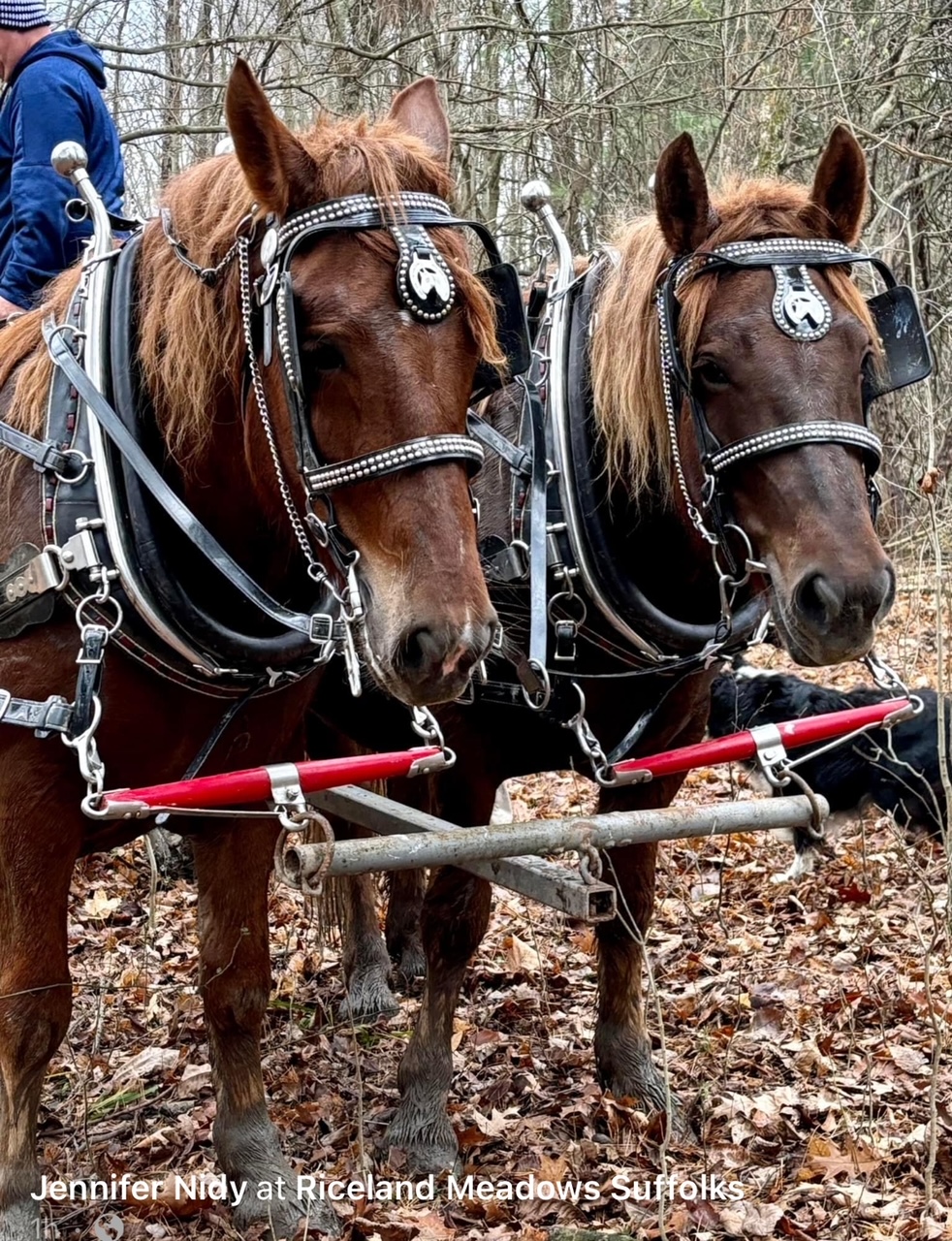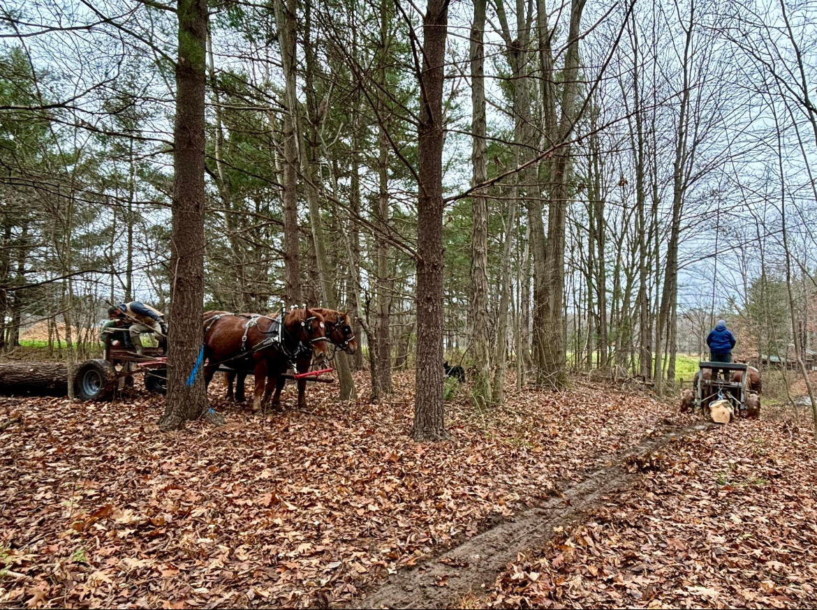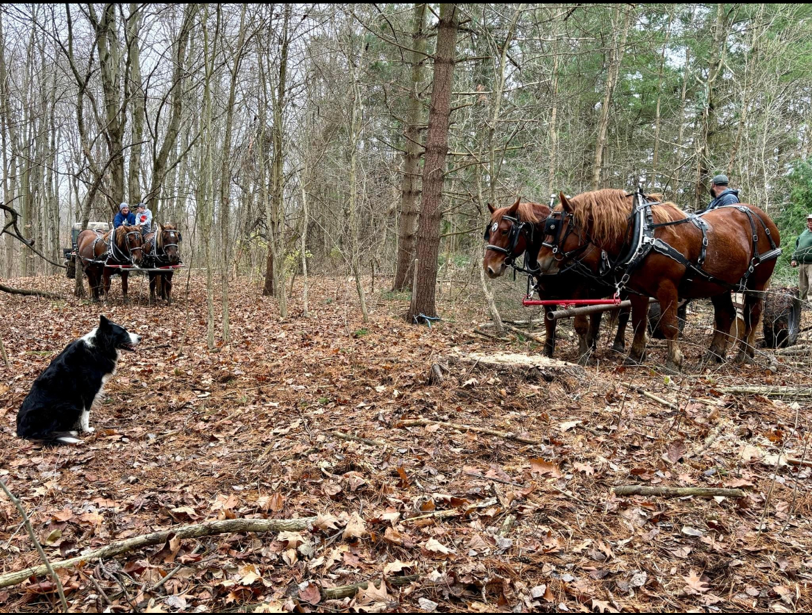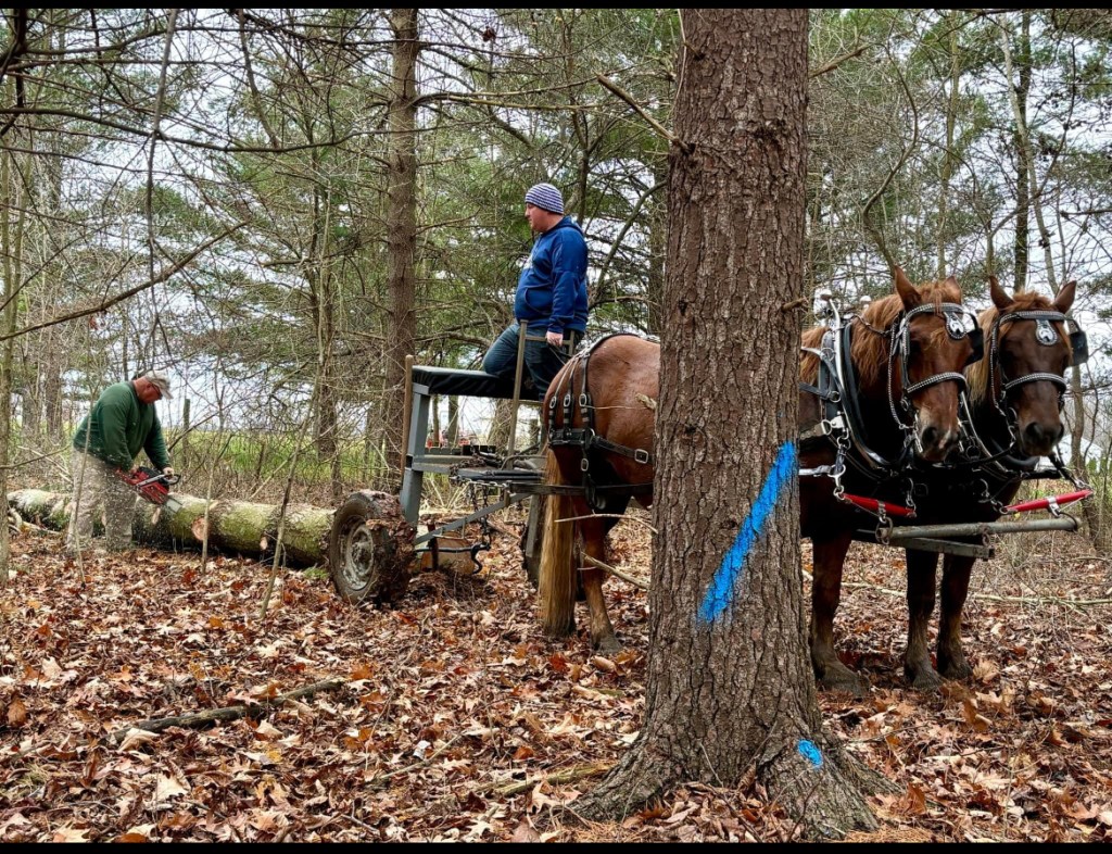 The team in the photo belongs to our youngest son Jake. Their names are Anna and Belle. They did a good job. We enlisted the help of our friends the Nidys. They are also Suffolk horse owners. So, we made it a “fun” day in the woods.