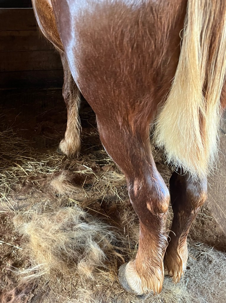 After her bath, I started working on her tail with my thinning comb. In no time at all, her tail was thinned and shaped. I like them at the length of their hocks. They have plenty of tail to fight the flies, yet it stays up out of the mud and snow. Most draft breeds tail’s are “bobbed” but I want mine to have their tails. The Suffolk horse breed standard expects the tails to be left, bone intact, as God made them. I agree with this.