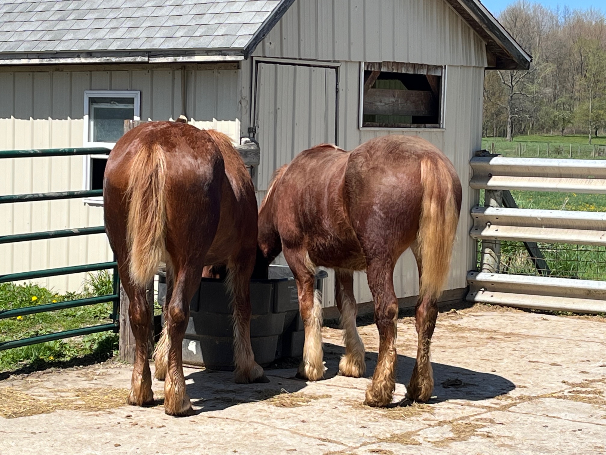 Our newly trimmed “Maggee” on the left with her friend “Joy” on the right. Magee just turned three and Joy is now two. They are my next trainees. They have both had many hours of hands on ground training but now the harness and hitching work begins.