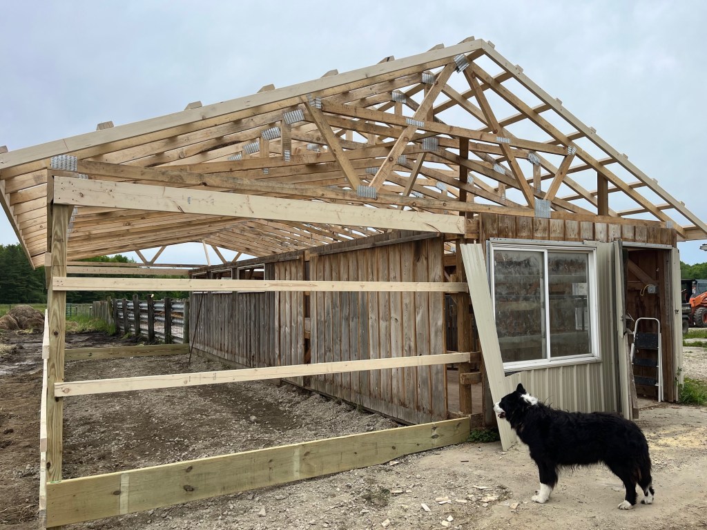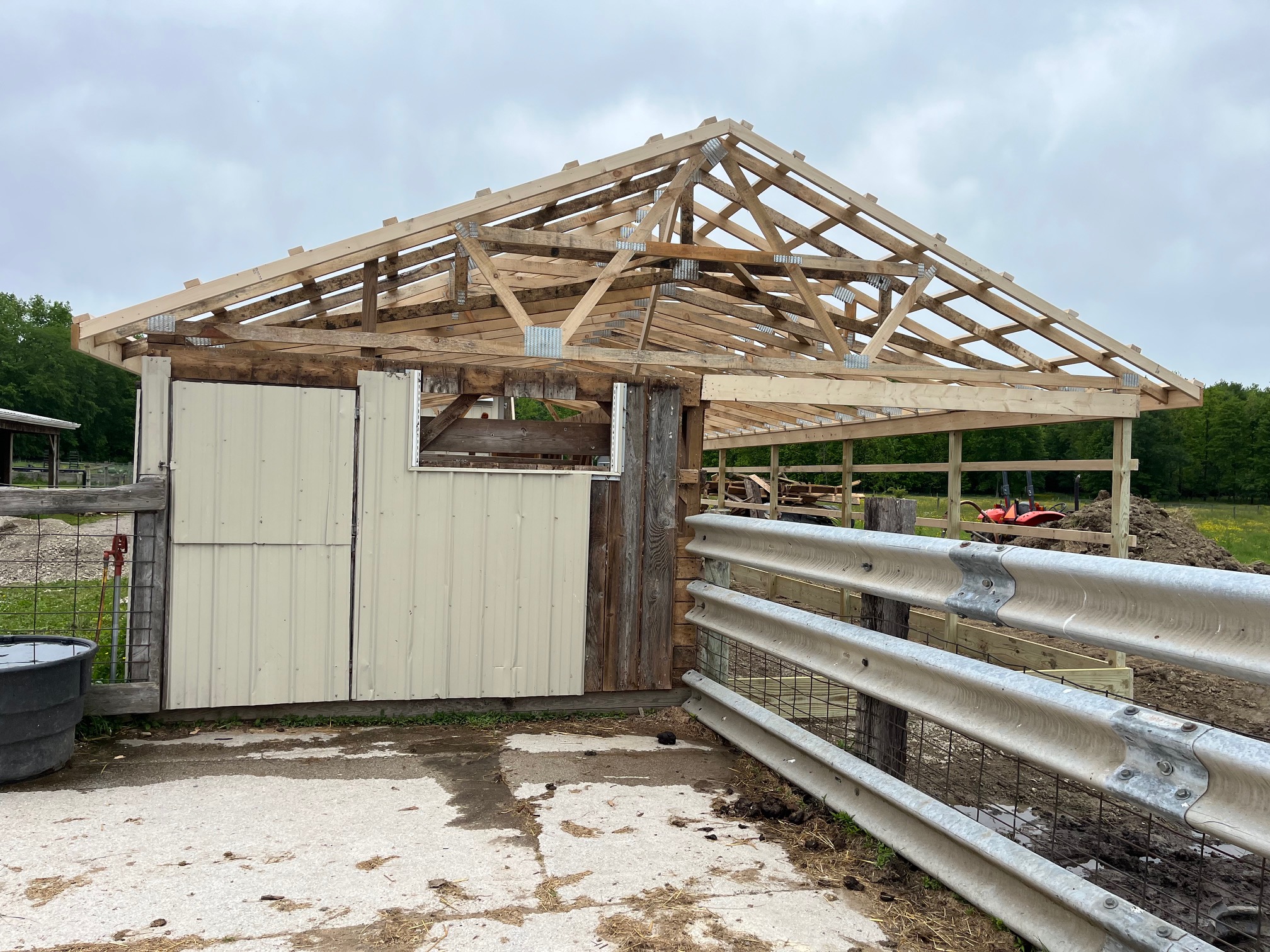 The old back wall will be removed and some new cement will be poured. I think this will work out great. It will give us seven tie stalls and a big aisleway. There will be a walkway in front of the horse stalls and along the end by the big window. Kiln dried lumber was added to the mix so that the screws for the metal roof won’t pull away from the drying pine. The project is coming along nicely. The trusses are 5:12 pitch of scissor design for height and airflow.