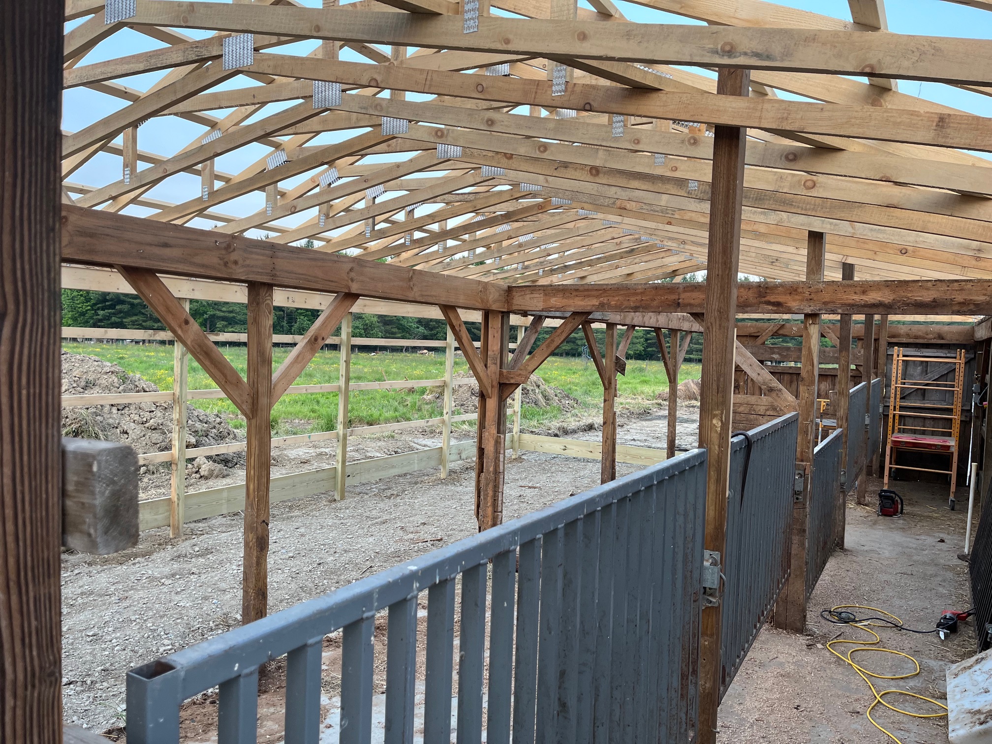 There is a little bit more to deconstruct before the stalls can go in. The building is starting to take shape. The stall posts will be made from 3 inch by 3 inch box channel. The wood for the stalls will be native hardwood beech or oak. The horses only spend a small portion of their day in a tie stall. They are for feeding, pasture rotations and to get a close eye on all of them every day.
