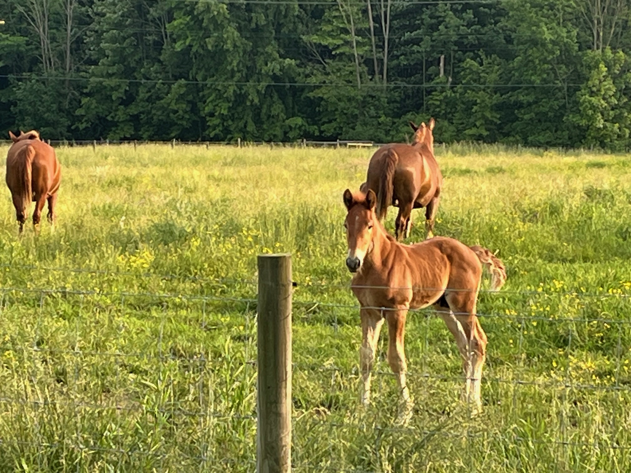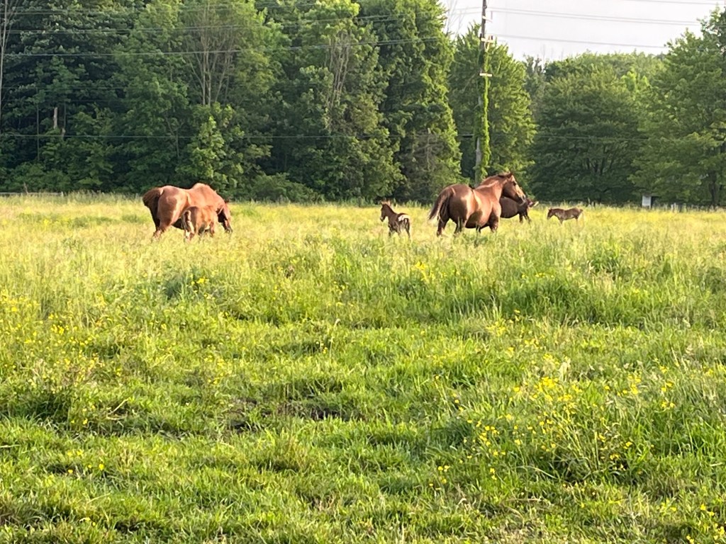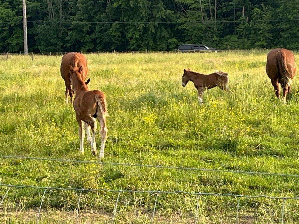 We are almost done foaling for 2025. We still have one more lady to go and she is overdue by a couple days. She is under constant watch. As we wait on the next baby, we get to watch the 5 foals born so far, play in the pastures.
