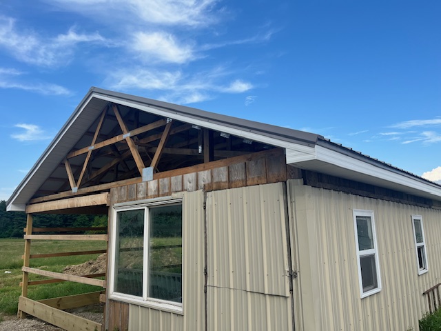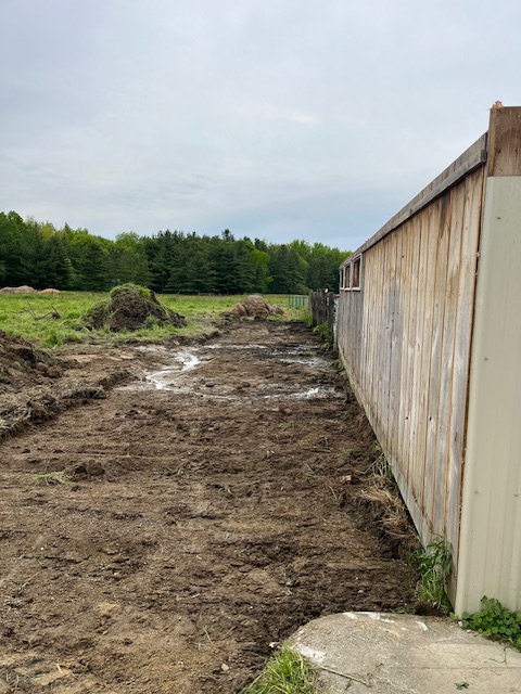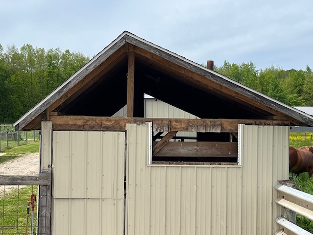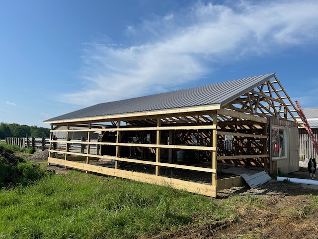 There is still much to do. Prepare for concrete, install siding and build the stalls. The siding is being sawed out at a local sawmill as I type. The hardwood lumber for the stalls has been ordered and will be here before I am ready. The concrete job is a big one for me, but I will get it all sorted out very soon. I am satisfied with the progress so far. The trusses were made by a local company from our white pine lumber. They did a fantastic job.