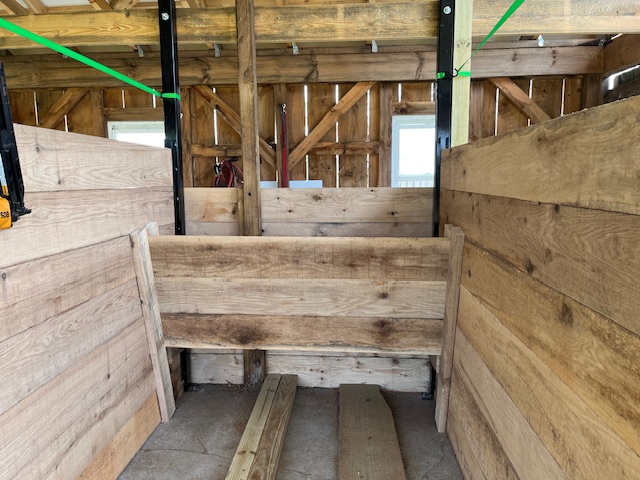 We completed the tie stalls and mangers yesterday. The material is native red oak. These stalls will hold hours for short periods during the day in summer keeping the horses cool and away from biting flies. During winter we use this style of stall overnight. The warm comfortable stalls are perfect for a cold winter’s night. The horses can lie down when they want, munch hay and enjoy the barn’s warmth. Rubber mats will be added for comfort once the renovation is complete. The stalls are 5 feet wide and just a little over 6 feet deep. Plenty of room for our Suffolk Punch horses.