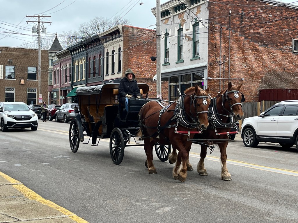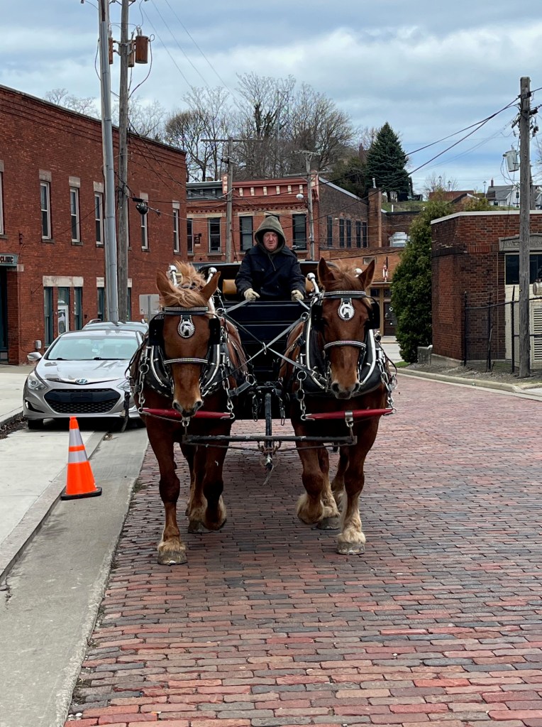 Today, we gave carriage rides in the Ashtabula Harbor historical district for Riverbend hotel. It was very warm yesterday, but today old man winter blew his strong cold breath on us the whole time we were there….it was cold.