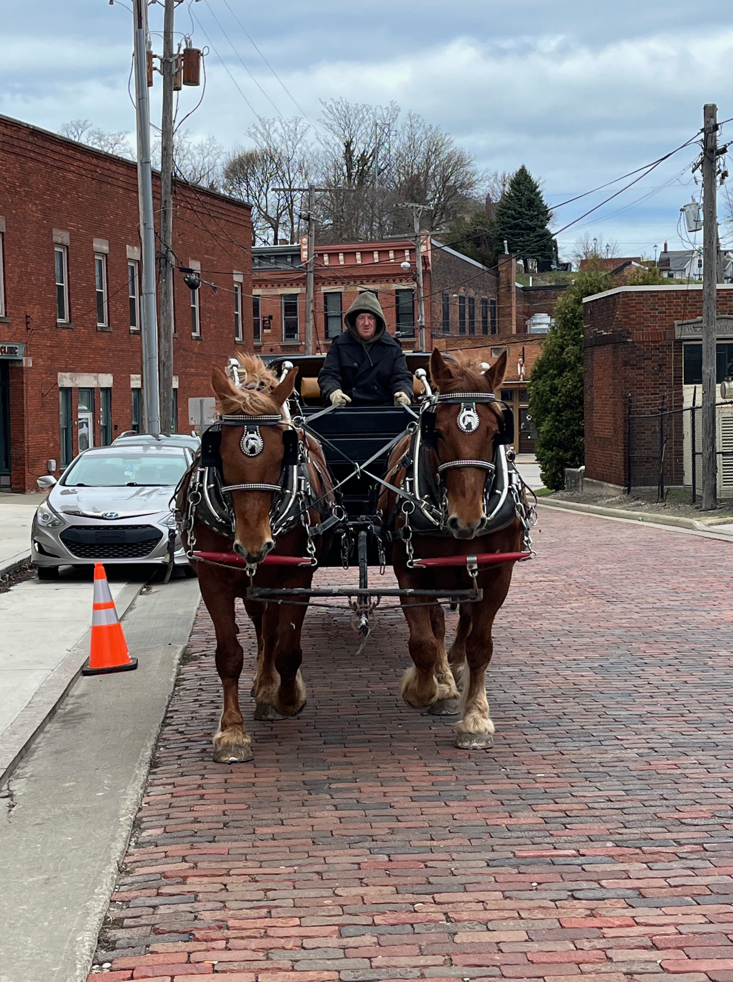Today, we gave carriage rides in the Ashtabula Harbor historical district for Riverbend hotel. It was very warm yesterday, but today old man winter blew his strong cold breath on us the whole time we were there….it was cold.
